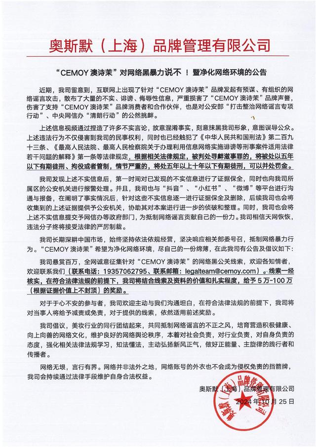 10月25日,微博“CEMOY澳诗茉”发文称,近日互联网出现针对该品牌的不实言论,已进行报警处理等。