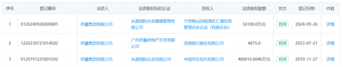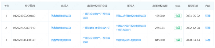 今年9月,侨鑫集团将所持从都国际生命健康管理有限公司100%股权,质押给了宁波梅山保税港区汇珊投资管理合伙企业(有限合伙);去年7月,将所持广州侨鑫房地产开发有限公司100%股权,质押给了浙商银行股份有限公司;去年5月,将所持广州东企房地产开发有限公司35%股权质押给前海人寿保险股份有限公司。