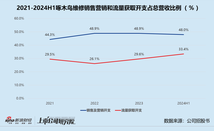 招股书披露,2021-2023年,公司的销售及营销开支分别约为1.78亿元、2.91亿元和4.94亿元,占各期总营收比例由44.3%提升至48.9%。2024年1-6月,啄木鸟维修该项支出达到2.99亿元,约占当期收入48.0%,同比增长4个百分点。其中,流量获取开支约为2.08亿元,占销售及营销费用近70%,约占总营收33.4%。