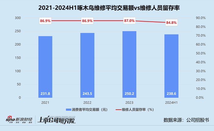 收费漫天要价、质量没有保障,消费者因此产生不满对平台黏性不足,啄木鸟维修只能不断地斥巨资吸引流量,利润空间持续被高企的营销费用吞噬。事实上,这种模式难以为继已经显露端倪。2024年截至6月30日,平台每单平均交易额约为238.6元,较2023年末约减少4.6%;维修人员留存率约为84.8%,是近三年半以来首次下滑。