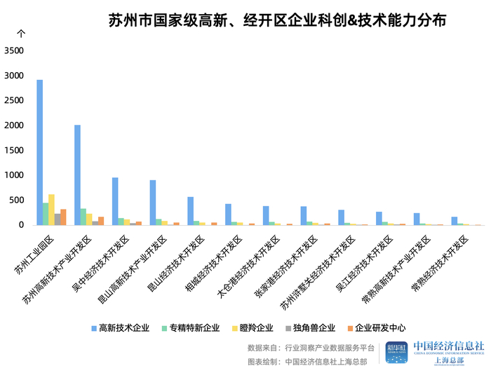 从企业科技创新与研发能力来看,苏州工业园区在高新技术企业、专精特新企业、瞪羚企业、独角兽企业、企业研发中心数量均位居12家之首。