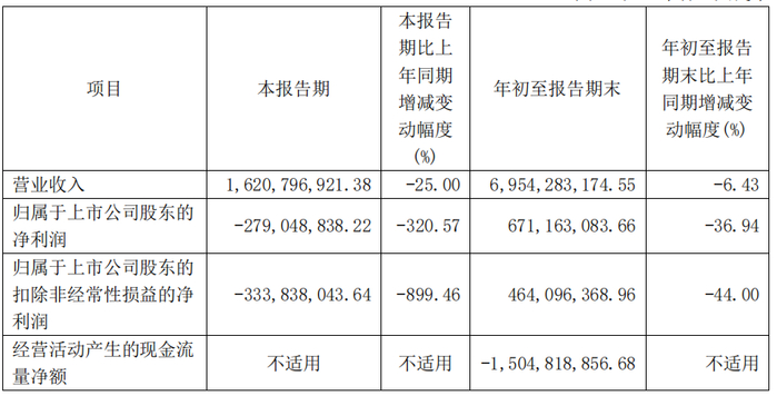 具体到第三季度,营收约16.21亿元,同比下降25%;归母净利润 -2.79亿元,同比下降320.57%;扣非归母净利润 -3.34亿元,同比下降899.46%。