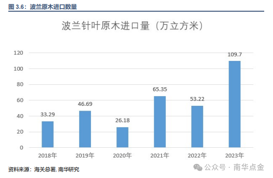 从波兰林业局的资料获悉,其本国原木产业每年砍伐中75%为软木,其中88%左右的木材用于国内生产,主要方向为纸浆和锯木和单板。真正用于出口的软木比例反倒不高而且其木材和木制品有82%在欧盟内部消化。意味着后续它的出口不会太高,除非欧盟内部的整体消化能力进一步减弱。至于其他国家占比较少或受到贸易摩擦和地缘因素的影响,在此暂不展开分析。