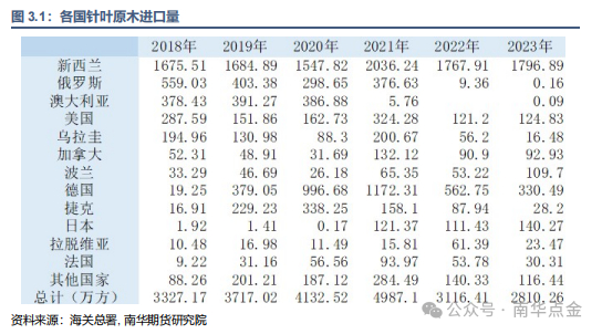 在进口结构上,中国原木来源多元,全球多个地区均有供应。在针叶原木方面,新西兰与欧洲是两大主要进口地,新西兰以其稳定的40%以上占比和高效的海运(一个月至一个半月)及低成本优势,持续占据领先地位。新西兰进口的原木2023年占比高达63.94%,品种为辐射松。其次是欧洲国家,如德国,2023年约贡献了11.7%的进口量,主要树种为云杉,但受虫害影响,其市场份额近两年有所下调。此外,随着2023年中国对澳大利亚原木进口禁令的解除,澳洲有望成为新的增长点。相比之下,美、加、澳等国因贸易环境变化,针叶原木进口量正在缩减。