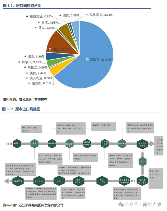 原木在建筑口料、建筑模板、运输包装等领域被广泛应用,据统计,2023表观消费月7378万立方。受到房地产建筑行业影响,近年来原木消费出现了整体下降的趋势。由于原木国内树种标准化、市场化程度较低,供给高度依靠进口,进口依赖度约为75%。进口来源地主要为新西兰、欧洲等,其中新西兰为最主要的进口来源,2023年在所有进口针叶原木中占比高达63.94%,其次是德国,占比11.76%。