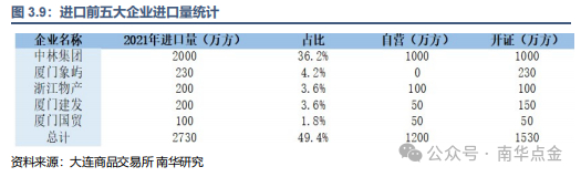 从进口贸易企业来看,大型企业较少,头部五家公司全市场进口占比31.3%,分别为中林集团、厦门象屿、浙江物产、厦门建发、厦门国贸。年进口量50万方以上的中型企业在30家以上,而小型贸易商则量更大更加分散。原木进口需要靠大型国企开证,头部效应明显,产业成熟。