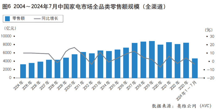 2024年1~7月,中国家电零售市场表现略微疲软,以旧换新、促进绿色家电消费的政策和活动频出,“618”活动提前至5月底,但房地产市场较为低迷,消费信心仍然不足,家电新增和换新需求有待进一步激活。奥维云网(AVC)推总数据显示,2024年1~7月,中国家电零售市场规模为4722亿元,同比下降4.3%(见图6)。整体来看,国内零售市场有4个方面的发展变化值得关注。