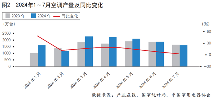 2024年,中国经济运行延续复苏态势,受到出口订单拉动,主要家电产品的产量都有明显回升。从产销数据来看,中国白电品类生产出货量均明显上涨。2024年1~7月,白电行业生产出货增速在10%以上,原材料价格上涨、外销需求恢复以及海外补库存等因素,刺激了相关产品的备货节奏,但内销市场持续低迷,行业库存高企。产业在线数据显示,2024年1~7月,空调行业累计产量为1.29亿台,同比增长13.5%;累计出货量为1.3亿台,同比增长13.2%。其中,7月产量为1612万台,同比下降2.0%(见图2)。