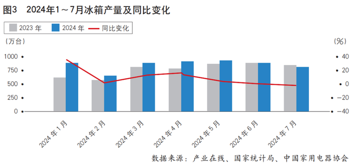 2024年1~7月,冰箱累计产量为5391万台,同比增长11.0%;累计出货量为5443.7万台,同比增长11.7%。其中,7月产量为753.4万台,同比下降0.5%(见图3)。