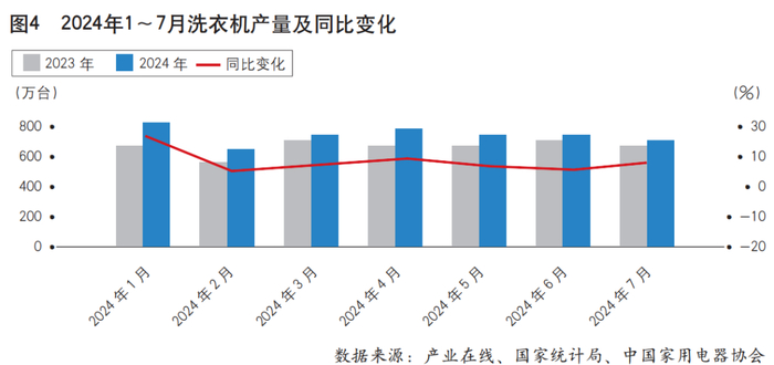 2024年1~7月,洗衣机累计产量为4785.4台,同比增长12.6%;累计出货量为4806.8万台,同比增长12.0%。其中,7月产量为671.8万台,同比增长9.1%,持续保持增长(见图4)。