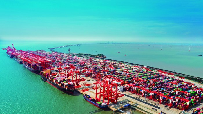 东海之滨,舟车辏集,吊机不停。码头上,桥吊矗立岸边,轨道吊灵活运转,自动导引车穿梭其间,一派繁忙景象。
