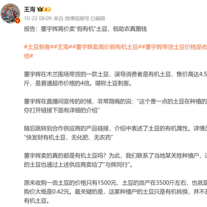10月22日,打假博主王海发文称,董宇辉在木兰围场带货的一款土豆,误导消费者是有机土豆,售价4.58元/斤,是普通超市价格的十倍。此外,与辉同行此次合作的供应商鑫达商贸公司认证的有机土豆产量只有32.38吨,而产品在董宇辉直播间销售了6.6万单,核算后销量在165吨以上。