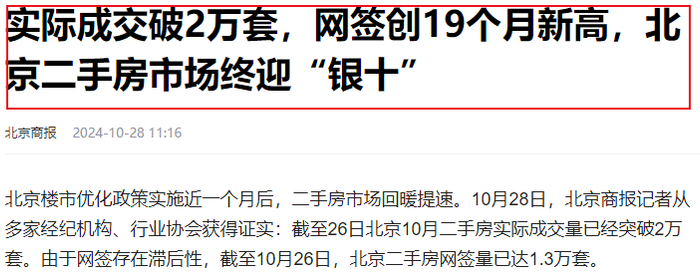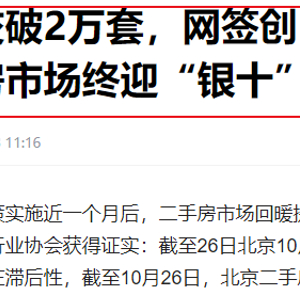 10月28日,北京商报记者从多家经纪机构、行业协会获得证实:截至26日北京10月二手房实际成交量已经突破2万套。由于网签存在滞后性,截至10月26日,北京二手房网签量已达1.3万套。