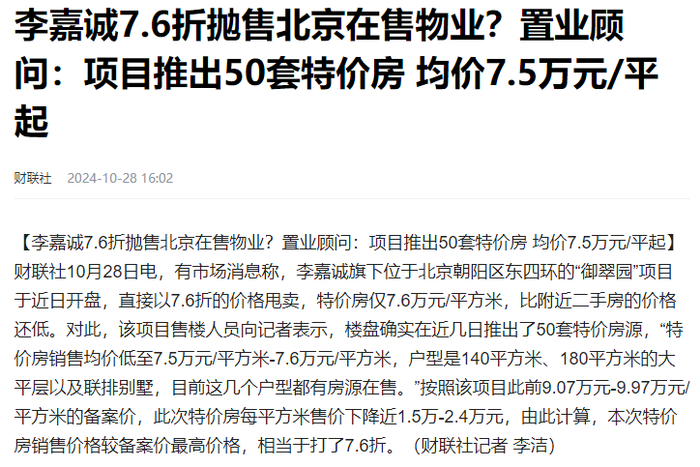 最近北京朝阳区东四环的“御翠园”开盘,被传出76折降价出售。