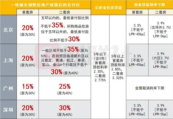 首套房首付由30%降至20%,商业贷款利率由原来的LPR-10BP降至LPR-45BP,降低了35个基点,根据目前的LPR计算,利率已经降至3.5%。