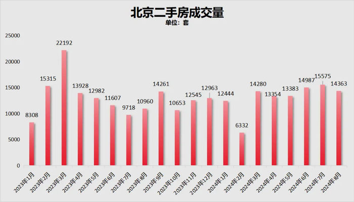 新政作用下,7月份北京的二手房成交量冲破了1.5万套,高达15575套。然而8月份又跌破了1.5万套,为14363套。