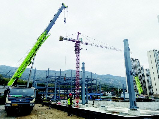 10月30日,记者在项目施工现场看到,北面主体4层钢结构已经吊装完毕,两台大型起重机正在施工人员的指挥下转动着吊臂安装钢结构立柱。