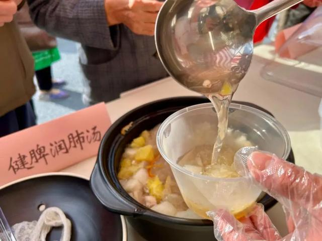 另一边,邻里时光社区食堂的6位大厨也铆足了劲,带来了6道尤其适合秋冬的养生菜。厨师团队负责人徐峰介绍,其中5道为广中社区卫生中心提供的药膳食谱,厨师前一晚泡好药材,今天一早从6点多煲到9点半,“这道健脾润肺汤,用了银耳、秋月梨、橙和多种药材,很滋补,润肺化痰。”