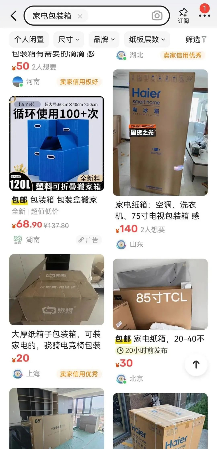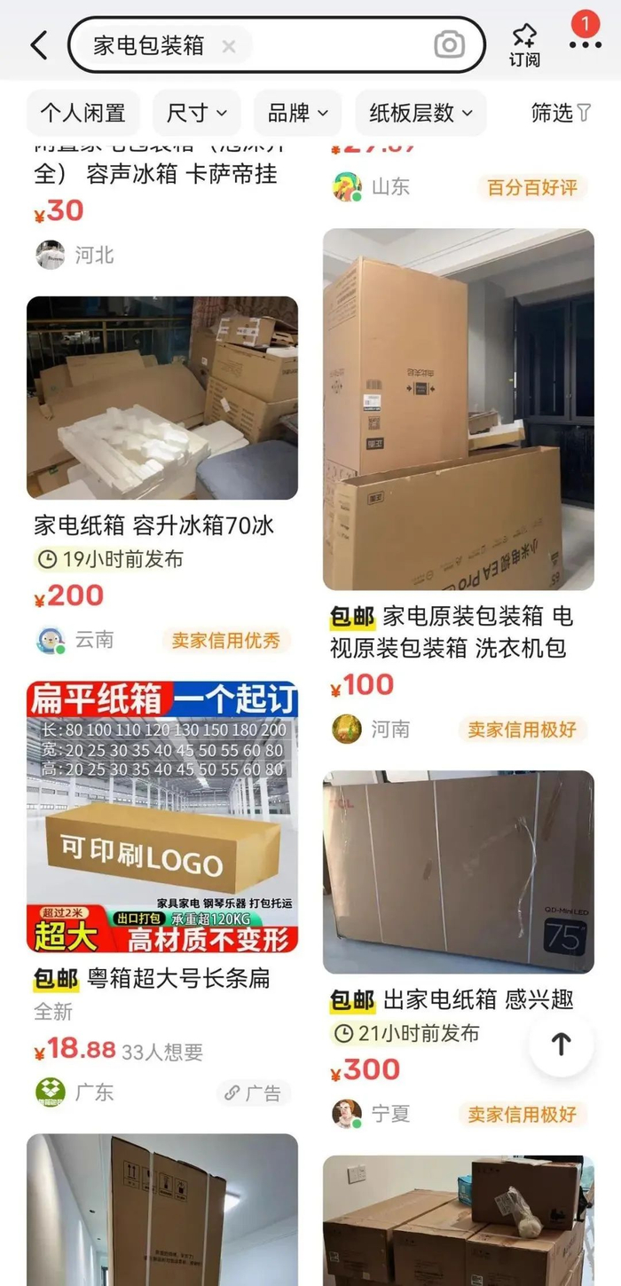 记者在二手交易平台上搜索关键词“家电包装箱”,跳出各类型号的包装箱,品牌涵盖了美的、格力、海尔、夏普、容声、海信、华为、创维、小米等市面上的常见品牌,价格从十几元到数百元不等。