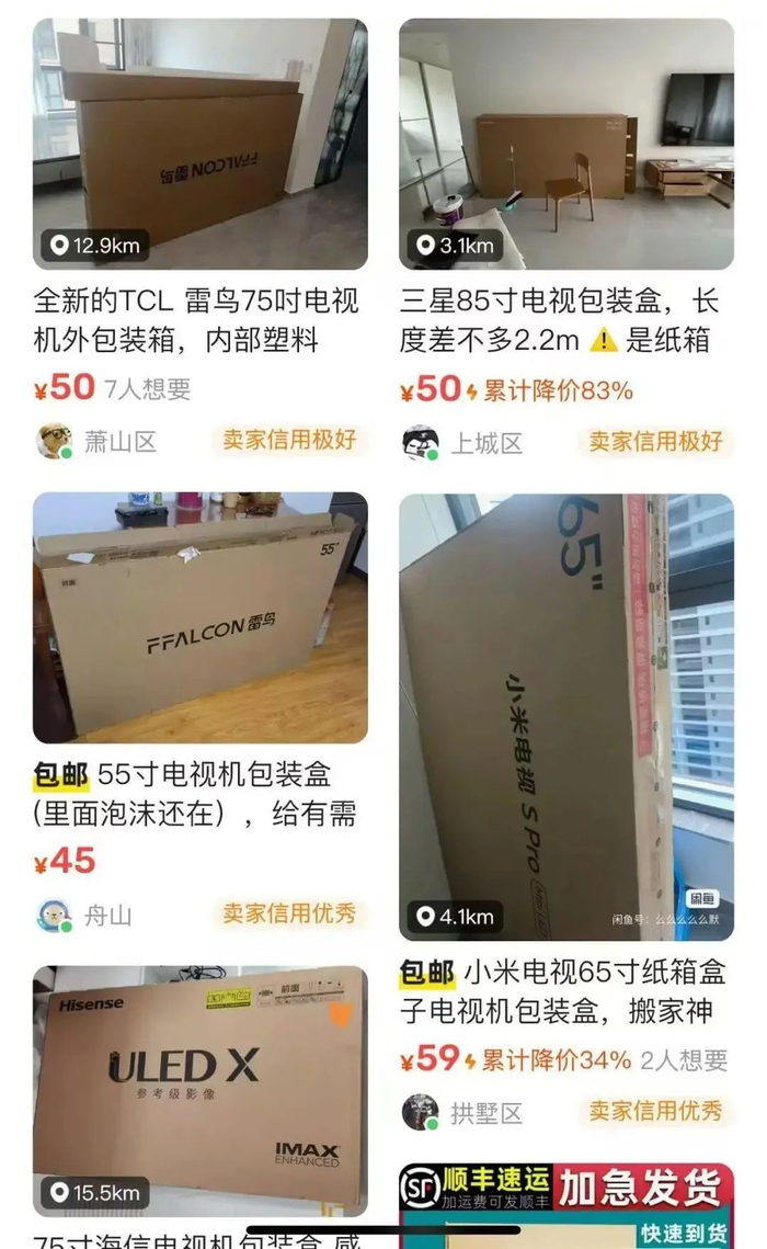 “我就是那个大冤种,算上运费花200买了个箱子。”另一位陈先生向记者吐槽,去年他就曾高价买过一个电视纸箱。陈先生表示,他的这款电视是85寸的,而且品牌有点小众,所以在二手交易平台上他也只找到一个卖家,价格50元,包含原纸箱和泡沫板等,他觉得能够接受。但因为距离较远,箱子又太大,快递只能找一个车来拉,于是运费需要150元。“当时急着换电视,没办法,只能花高价买了。”