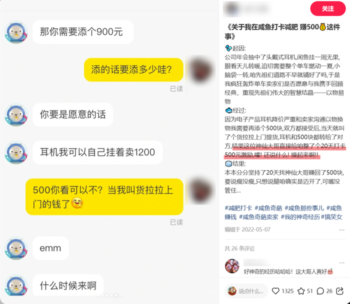 当两个年轻人在闲鱼上相遇,试图以物易物,一次 20 天打卡立减 500 元的激励无厘头的诞生。