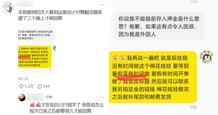 有人在闲鱼上卖自己手工做的娃娃,遇到想要下单的外国人,在翻译器的帮助下,一场有趣的国际交易就此开始。