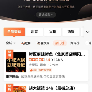 独特口味与贴心服务的加持下,继2023年9月当选大众点评成都、重庆美食热门榜第一名后,2024年10月,烤匠多日稳居大众点评北京美食热门榜第一名,成为北京新晋美食顶流。