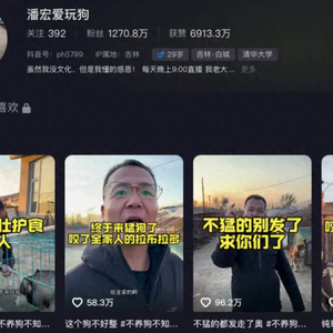 此前,“潘宏爱玩狗”以抽象训狗、直播连线互动等方式火出圈,目前某平台粉丝量已达1270.8万。