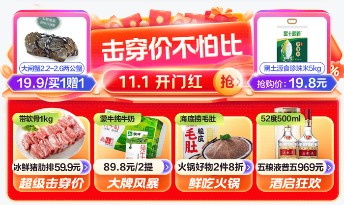 0.99元的海底捞火锅底料,19.9元买一赠一的黄河口大闸蟹,388元的20年青花汾酒……11月1日上午,京东七鲜公众号发布文章《击穿!不怕比》,全面上线“击穿价真便宜不怕比“活动。