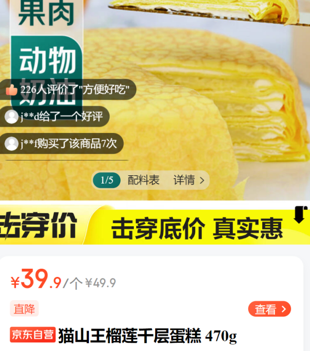 京东七鲜猫山王榴莲蛋糕