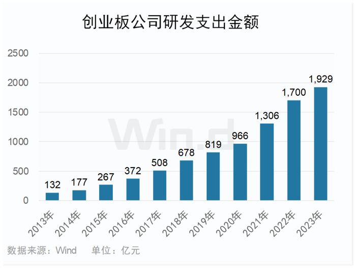 15年来,创业板公司累计总研发支出近9000亿元, Wind数据显示,2017年创业板公司研发支突破500亿,2021年研发支出破千亿,而2023年研发支出接近2000亿。创业板公司研发投入全面加速,为创新提供强有力的保障。