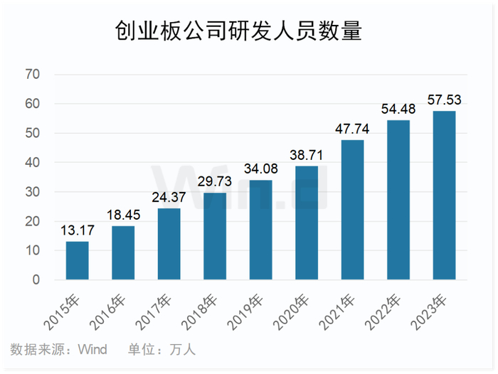 研发人员也快速增长。目前创业板公司中,研发人员合计超57.5万人,平均每家公司研发人员超400人。2015年至2023年,研发人员总数由13.17万人增长至57.53万人,增长迅速。