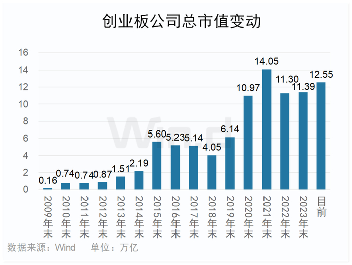 总市值规模也快速增长,Wind数据显示,创业板公司总市值自2009年末0.16万亿增长到目前12.55万亿,年化平均增长达33.7%。