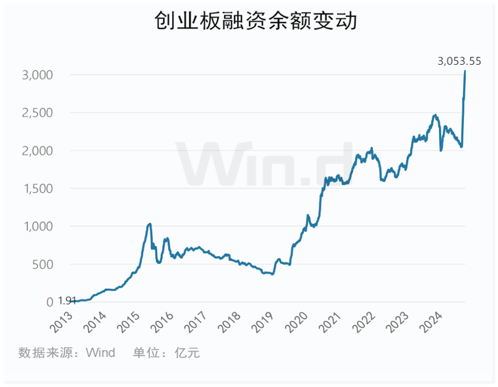创业板个股受到市场资金追捧,融资规模持续增长。2013年创业板进入融资融券标的开始,融资余额由0逐渐发展到如今的3053.55亿,不断创历史新高,受到杠杆资金持续青睐。