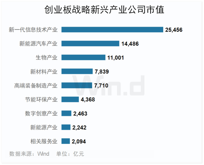 此外创业板战略性新兴产业公司有928家,占比高达68.34%。其中新一代信息技术产业、高端装备制造产业、新材料产业、节能环保产业和生物产业上市公司均超100家,占比都在8%以上。尤其是新一代信息技术产业、新能源汽车产业、生物产业等优势产业发展领先,三大产业公司总市值合计达5.09万亿,每个产业公司总市值都在万亿之上。