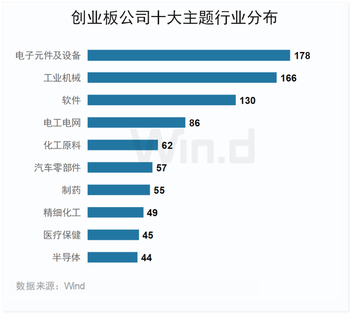 创业板上市公司涉及55个Wind主题行业,涉及各行各业。其中电子元件及设备、工业机械和软件等行业公司都在100家以上,三大主题行业公司占比总数达35%。