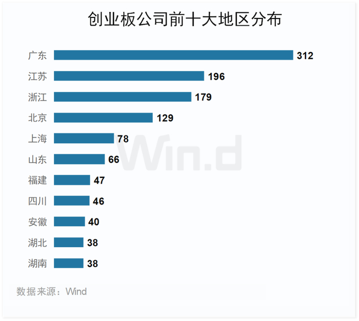 创业板上市公司广泛分布在30个省市,其中广东、江苏、浙江、北京和上市数量最多。