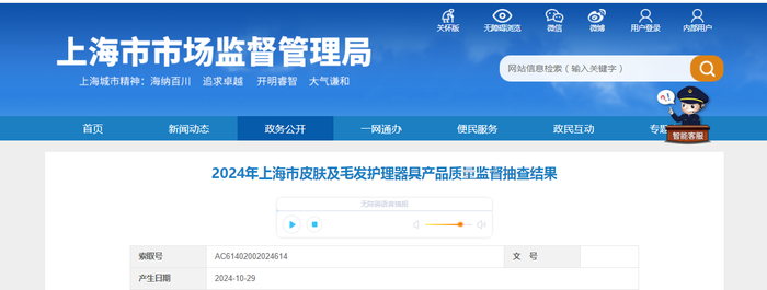 中国质量新闻网讯 近日,上海市市场监管局网站发布2024年上海市皮肤及毛发护理器具产品质量监督抽查结果。