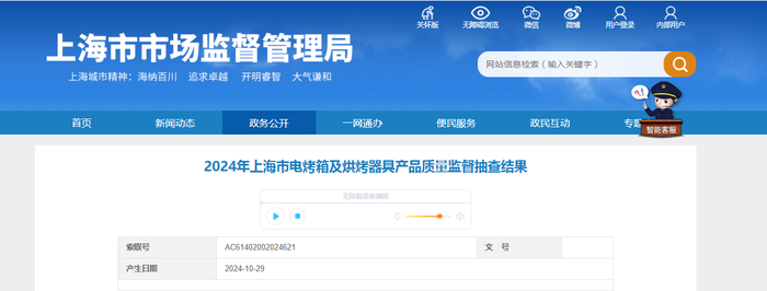 中国质量新闻网讯 近日,上海市市场监管局网站发布2024年上海市电烤箱及烘烤器具产品质量监督抽查结果。