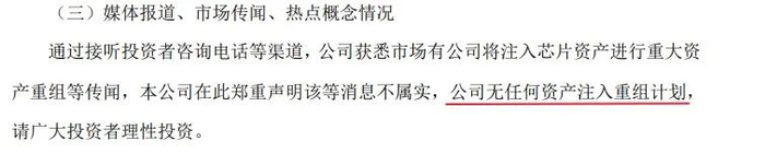 与此同时,公司在同一天还公布了一个消息,否认了市场传闻中有公司将注入芯片资产进行重组等传言。这条公告直接击碎了炒作重组的“泡沫”!既然预期落空,那么此前因这个预期而被炒起来的股价,自然就得从哪儿来回哪儿去咯。