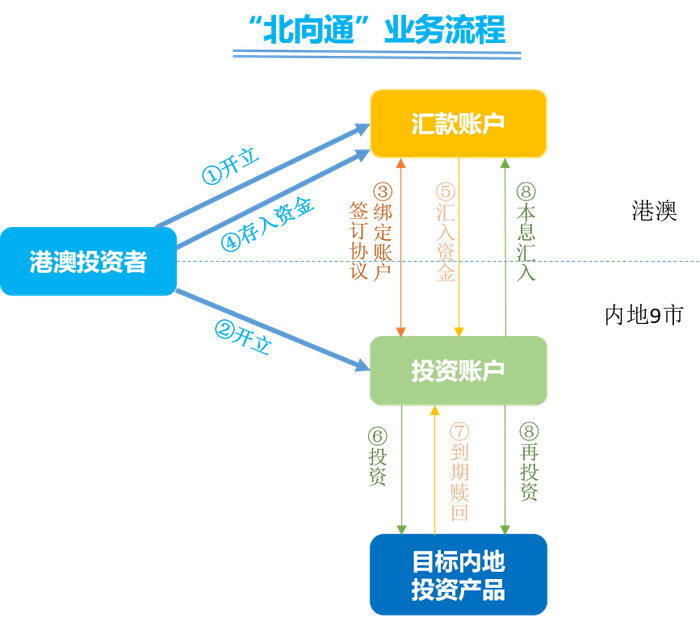 “北向通”:港澳投资者在粤港澳大湾区内地销售机构开立个人投资账户,通过闭环式资金管道汇入资金购买内地销售机构销售的投资产品。