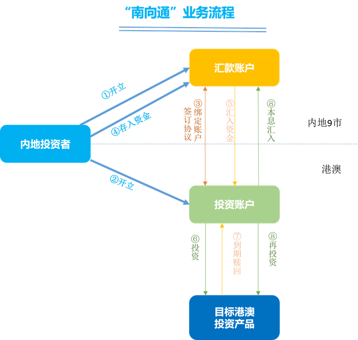 “南向通”:粤港澳大湾区内地投资者在港澳销售机构开立个人投资账户,通过闭环式资金管道汇出资金购买港澳销售机构销售的投资产品。