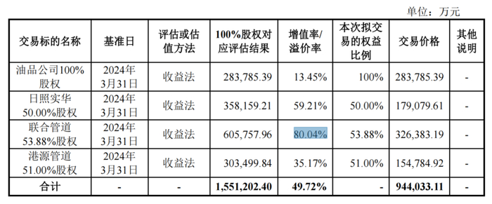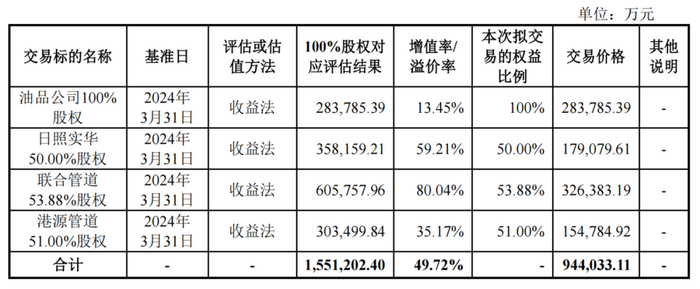 具体来看,此次重组是标的公司中,联合管道增值率为80.04%,日照实华的增值率为59.21%。