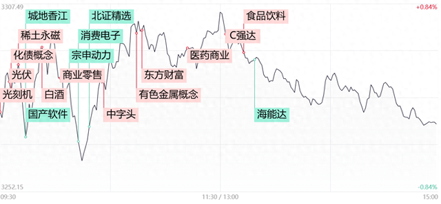 财联社11月1日讯,市场全天震荡分化,沪指相对偏强,创业板指午后持续走低,北证50指数大跌9.61%,高位股大面积跌停。沪深两市全天成交额2.23万亿,较上个交易日放量131亿。全市场逾500股跌超9%,海能达、凤凰航运等多股上演“天地板”。盘面上,周期股集体走强,稀土永磁板块大涨,正海磁材、金力永磁、中国稀土、北方稀土等20余股涨停。医药商业概念股震荡走高,漱玉平民、老百姓、第一医药、健之佳等涨停。大消费股表现活跃,白酒、食品股领涨,水井坊、麦趣尔、黑芝麻等涨停。下跌方面,并购重组、软件、半导体、鸿蒙等多个近期热门的题材板块集体大跌。整体上个股跌多涨少,全市场超4300只个股下跌。截至收盘,沪指跌0.24%,深成指跌1.28%,创业板指跌1.88%。