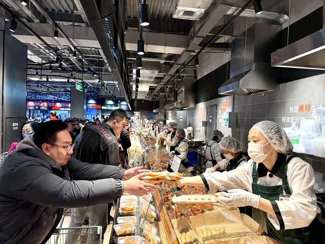 记者在店内停留的两个小时中,人气最高的熟食区和烘焙区一直排着长队。“您可以先去逛一圈,回来就烹制好了。”工作人员说,热销的现制商品一天至少要补货十几次。透明玻璃窗后的烘焙间也在开足马力生产,最受欢迎的核桃满满乳酪面包上架就“秒空”,榴莲千层蛋糕一天能售出千余盒。