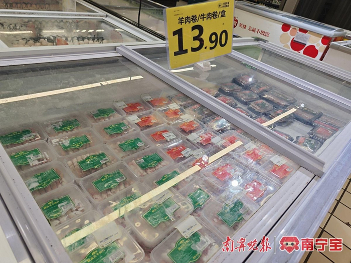 在北京华联生活超市南宁江南店,冷柜里整齐地摆上了各类火锅食材,除了传统的牛羊肉卷、肉丸等速冻产品外,还有精修牛腩块、牛杂等速冻原切肉类,吸引了不少顾客。一名工作人员介绍,最近天气转凉后,品牌肉类和丸子等火锅食材销售火热,其中牛肉卷、羊肉卷销量最受顾客欢迎。