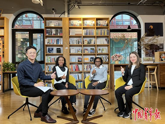 近日,北京前门青年书店,“青春中国·拥Bao未来”之“文明·互鉴”节目拍摄现场,中青报·中青网记者傅瑞(左一)对话北京交通大学肯尼亚籍留学生王佳莉(左二)、沐蕊(左三)和首都师范大学匈牙利籍留学生胡灵月(右一)。中青报·中青网记者 范雪/摄