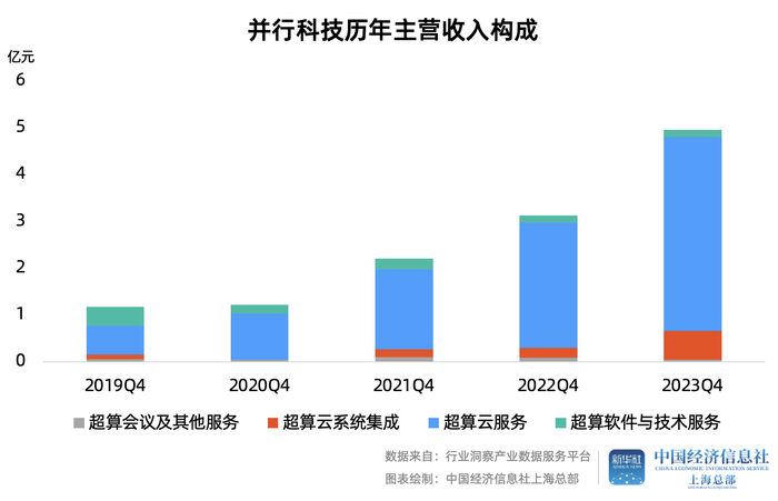 行业洞察系统数据显示,近5年来,并行科技主营收入持续高速增长,其中超算云服务收入占比快速提升,而去年公司超算软件与技术服务这块的收入也大幅提高。