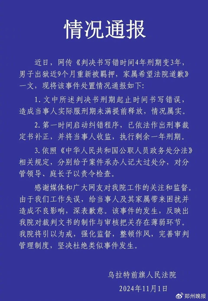 11月1日,内蒙古乌拉特前旗人民法院就网传《判决书写错时间4年刑期变3年:男子出狱近9个月重新被羁押,家属希望法院道歉》发布情况通报:案件承办人被记大过处分,对分管领导、庭长予以责令检查。