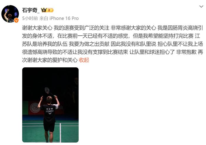 10月31日晚进行的2024年全国羽毛球团体锦标赛男团1/4决赛上,江苏队的石宇奇退赛一幕让球迷心疼不已。
